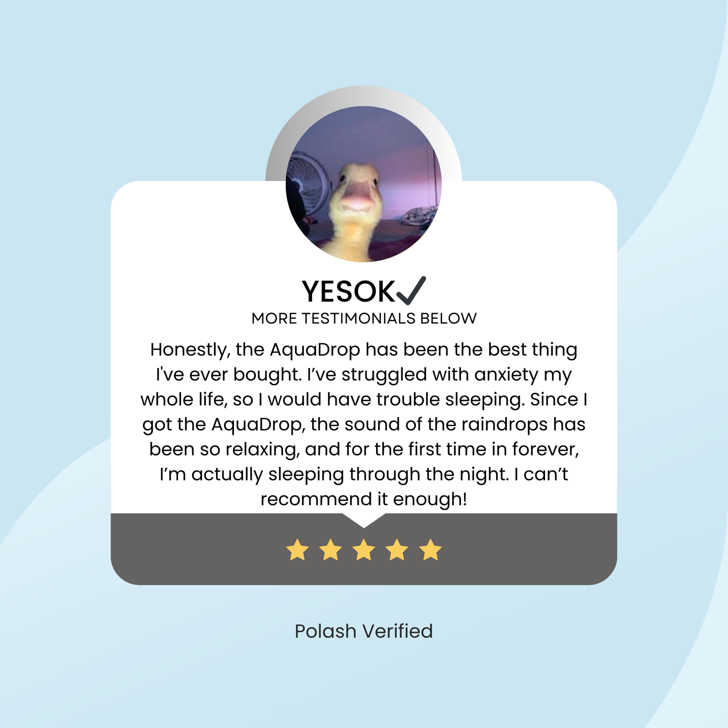 Stated that the Aquadrop felt like real raindrops & gave that stress free, cozy experience which helped with having deep & restful sleeps as it significantly improved air quality, reducing dryness.